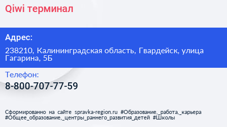 Qiwi, терминал по адресу 238210, Калининградская область, Гвардейск, улица Гагарина, 5Б в дальнейшем Организация, размещена в следующих категориях: