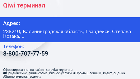 Qiwi, терминал по адресу 238210, Калининградская область, Гвардейск, Степана Козака, 1 в дальнейшем Организация, размещена в следующих категориях: