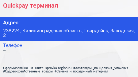 Quickpay, терминал по адресу 238224, Калининградская область, Гвардейск, Заводская, 2 в дальнейшем Организация, размещена в следующих категориях: