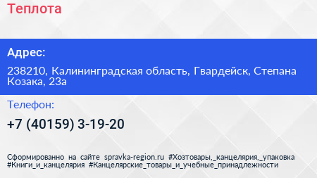 Теплота по адресу 238210, Калининградская область, Гвардейск, Степана Козака, 23а в дальнейшем Организация, размещена в следующих категориях: