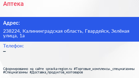 Аптека по адресу 238224, Калининградская область, Гвардейск, Зелёная улица, 1а в дальнейшем Организация, размещена в следующих категориях: