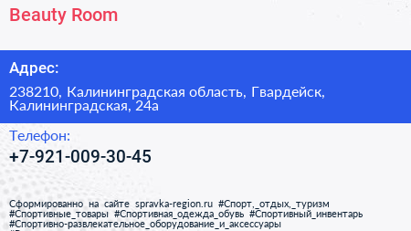 Beauty Room по адресу 238210, Калининградская область, Гвардейск, Калининградская, 24а в дальнейшем Организация, размещена в следующих категориях: