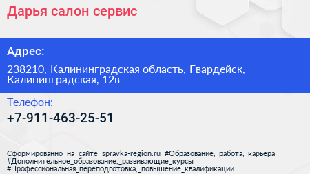 Дарья, салон-сервис по адресу 238210, Калининградская область, Гвардейск, Калининградская, 12в в дальнейшем Организация, размещена в следующих категориях: