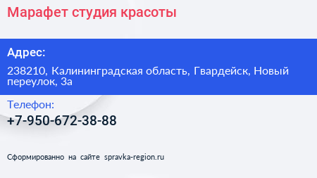 Марафет, студия красоты по адресу 238210, Калининградская область, Гвардейск, Новый переулок, 3а в дальнейшем Организация, размещена в следующих категориях: