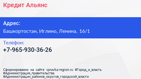 Кредит-Альянс по адресу Башкортостан, Иглино, Ленина, 16/1 в дальнейшем Организация, размещена в следующих категориях: