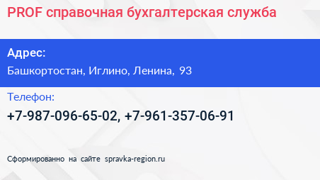 PROF, справочная бухгалтерская служба по адресу Башкортостан, Иглино, Ленина, 93 в дальнейшем Организация, размещена в следующих категориях: