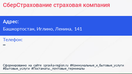СберСтрахование, страховая компания по адресу Башкортостан, Иглино, Ленина, 141 в дальнейшем Организация, размещена в следующих категориях: