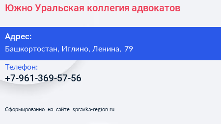 Южно-Уральская коллегия адвокатов по адресу Башкортостан, Иглино, Ленина, 79 в дальнейшем Организация, размещена в следующих категориях: