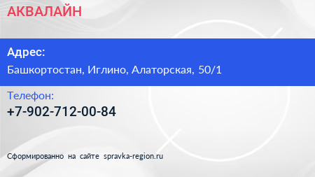 АКВАЛАЙН по адресу Башкортостан, Иглино, Алаторская, 50/1 в дальнейшем Организация, размещена в следующих категориях: