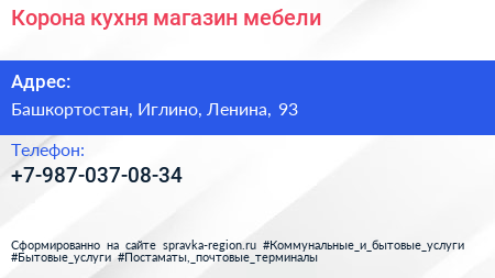 Корона кухня, магазин мебели по адресу Башкортостан, Иглино, Ленина, 93 в дальнейшем Организация, размещена в следующих категориях: