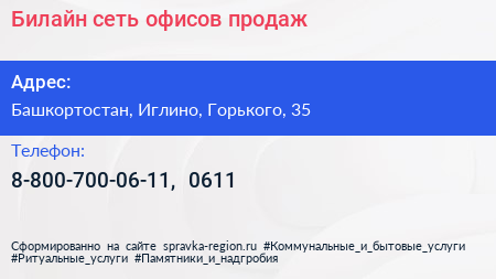 Билайн, сеть офисов продаж по адресу Башкортостан, Иглино, Горького, 35 в дальнейшем Организация, размещена в следующих категориях:
