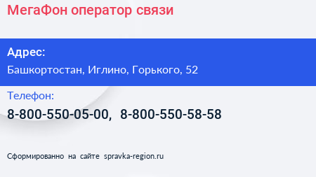 МегаФон, оператор связи по адресу Башкортостан, Иглино, Горького, 52 в дальнейшем Организация, размещена в следующих категориях: