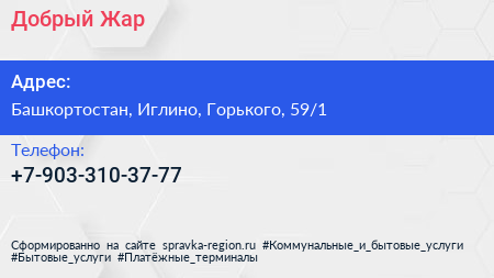 Добрый Жар по адресу Башкортостан, Иглино, Горького, 59/1 в дальнейшем Организация, размещена в следующих категориях: