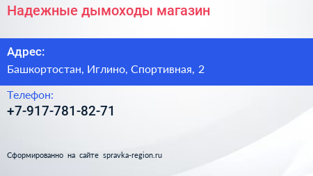 Надежные дымоходы, магазин по адресу Башкортостан, Иглино, Спортивная, 2 в дальнейшем Организация, размещена в следующих категориях: