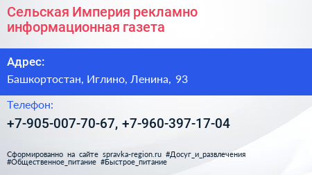 Сельская Империя, рекламно-информационная газета по адресу Башкортостан, Иглино, Ленина, 93 в дальнейшем Организация, размещена в следующих категориях: