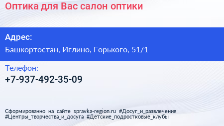 Оптика для Вас, салон оптики по адресу Башкортостан, Иглино, Горького, 51/1 в дальнейшем Организация, размещена в следующих категориях: