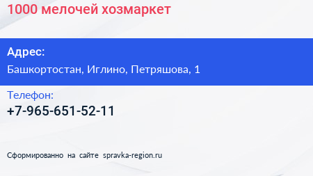 1000 мелочей, хозмаркет по адресу Башкортостан, Иглино, Петряшова, 1 в дальнейшем Организация, размещена в следующих категориях: