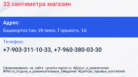 33 сантиметра, магазин по адресу Башкортостан, Иглино, Горького, 16 в дальнейшем Организация, размещена в следующих категориях: