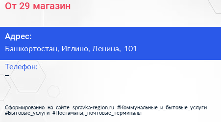 От 29, магазин по адресу Башкортостан, Иглино, Ленина, 101 в дальнейшем Организация, размещена в следующих категориях: