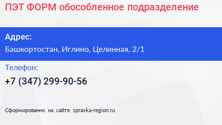 ПЭТ-ФОРМ, обособленное подразделение по адресу Башкортостан, Иглино, Целинная, 2/1 в дальнейшем Организация, размещена в следующих категориях: