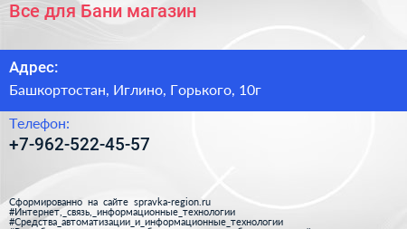 Все для Бани, магазин по адресу Башкортостан, Иглино, Горького, 10г в дальнейшем Организация, размещена в следующих категориях: