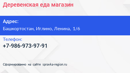 Деревенская еда, магазин по адресу Башкортостан, Иглино, Ленина, 1/6 в дальнейшем Организация, размещена в следующих категориях: