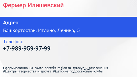 Фермер Илишевский по адресу Башкортостан, Иглино, Ленина, 5 в дальнейшем Организация, размещена в следующих категориях: