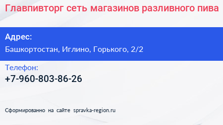 Главпивторг, сеть магазинов разливного пива по адресу Башкортостан, Иглино, Горького, 2/2 в дальнейшем Организация, размещена в следующих категориях: