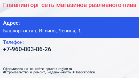 Главпивторг, сеть магазинов разливного пива по адресу Башкортостан, Иглино, Ленина, 1 в дальнейшем Организация, размещена в следующих категориях: