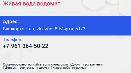 Живая вода, водомат по адресу Башкортостан, Иглино, 8 Марта, 61/3 в дальнейшем Организация, размещена в следующих категориях: