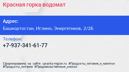 Красная горка, водомат по адресу Башкортостан, Иглино, Энергетиков, 2/2Б в дальнейшем Организация, размещена в следующих категориях:
