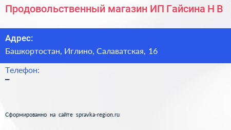 Продовольственный магазин, ИП Гайсина Н.В. по адресу Башкортостан, Иглино, Салаватская, 16 в дальнейшем Организация, размещена в следующих категориях: