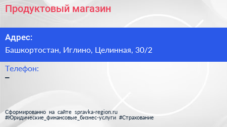 Продуктовый магазин по адресу Башкортостан, Иглино, Целинная, 30/2 в дальнейшем Организация, размещена в следующих категориях: