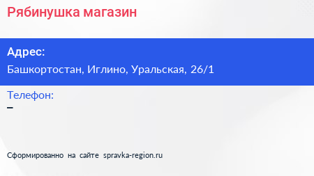 Рябинушка, магазин по адресу Башкортостан, Иглино, Уральская, 26/1 в дальнейшем Организация, размещена в следующих категориях: