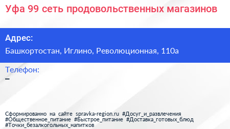 Уфа-99, сеть продовольственных магазинов по адресу Башкортостан, Иглино, Революционная, 110а в дальнейшем Организация, размещена в следующих категориях: