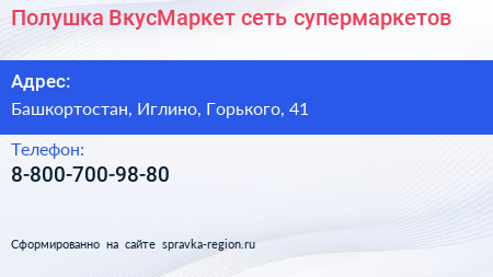 Полушка ВкусМаркет, сеть супермаркетов по адресу Башкортостан, Иглино, Горького, 41 в дальнейшем Организация, размещена в следующих категориях: