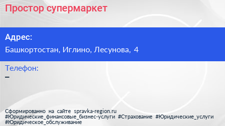 Простор, супермаркет по адресу Башкортостан, Иглино, Лесунова, 4 в дальнейшем Организация, размещена в следующих категориях: