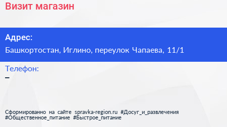 Визит, магазин по адресу Башкортостан, Иглино, переулок Чапаева, 11/1 в дальнейшем Организация, размещена в следующих категориях: