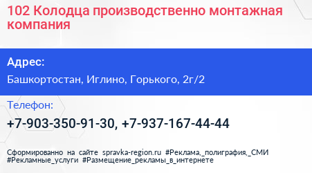 102 Колодца, производственно-монтажная компания по адресу Башкортостан, Иглино, Горького, 2г/2 в дальнейшем Организация, размещена в следующих категориях:
