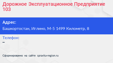 Дорожное Эксплуатационное Предприятие №103 по адресу Башкортостан, Иглино, М-5 1499 Километр, 8 в дальнейшем Организация, размещена в следующих категориях: