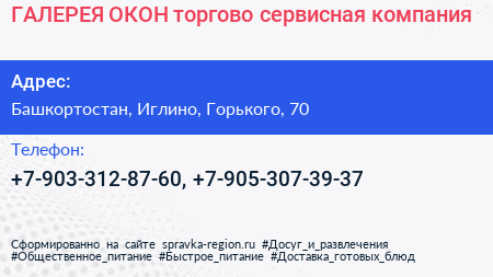 ГАЛЕРЕЯ ОКОН, торгово-сервисная компания по адресу Башкортостан, Иглино, Горького, 70 в дальнейшем Организация, размещена в следующих категориях: