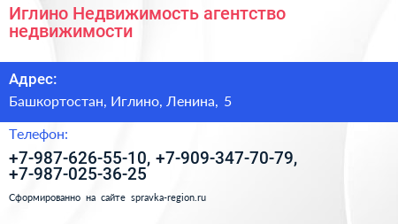 Иглино-Недвижимость, агентство недвижимости по адресу Башкортостан, Иглино, Ленина, 5 в дальнейшем Организация, размещена в следующих категориях: