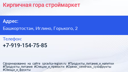 Кирпичная гора, строймаркет по адресу Башкортостан, Иглино, Горького, 2 в дальнейшем Организация, размещена в следующих категориях: