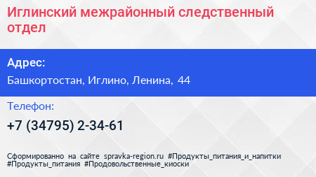 Иглинский межрайонный следственный отдел по адресу Башкортостан, Иглино, Ленина, 44 в дальнейшем Организация, размещена в следующих категориях: