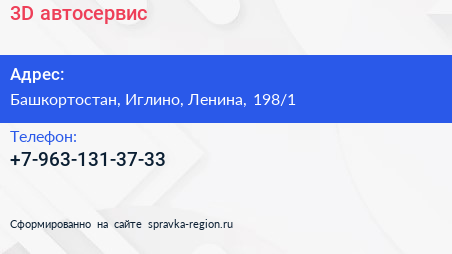 3D, автосервис по адресу Башкортостан, Иглино, Ленина, 198/1 в дальнейшем Организация, размещена в следующих категориях: