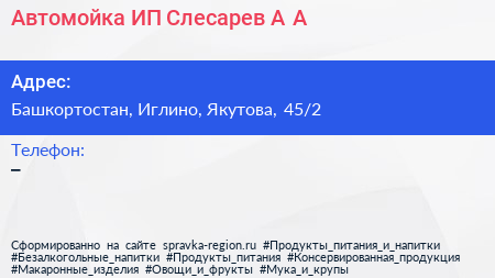 Автомойка, ИП Слесарев А.А. по адресу Башкортостан, Иглино, Якутова, 45/2 в дальнейшем Организация, размещена в следующих категориях: