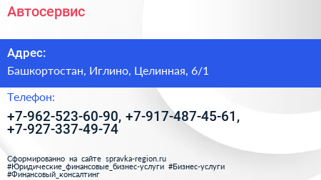 Автосервис по адресу Башкортостан, Иглино, Целинная, 6/1 в дальнейшем Организация, размещена в следующих категориях: