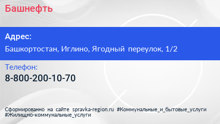 Башнефть по адресу Башкортостан, Иглино, Ягодный переулок, 1/2 в дальнейшем Организация, размещена в следующих категориях: