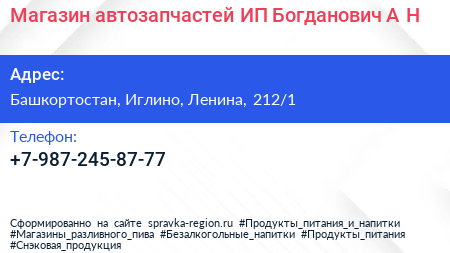 Магазин автозапчастей, ИП Богданович А.Н. по адресу Башкортостан, Иглино, Ленина, 212/1 в дальнейшем Организация, размещена в следующих категориях: