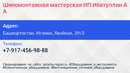 Шиномонтажная мастерская, ИП Ибатуллин А.А. по адресу Башкортостан, Иглино, Хвойная, 29/2 в дальнейшем Организация, размещена в следующих категориях: